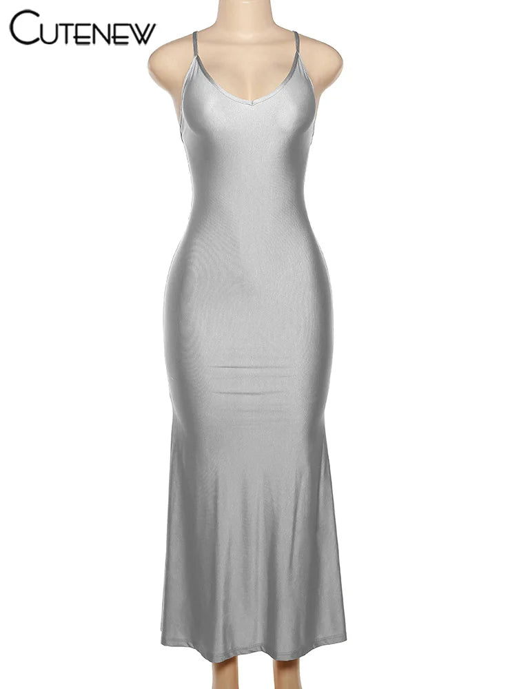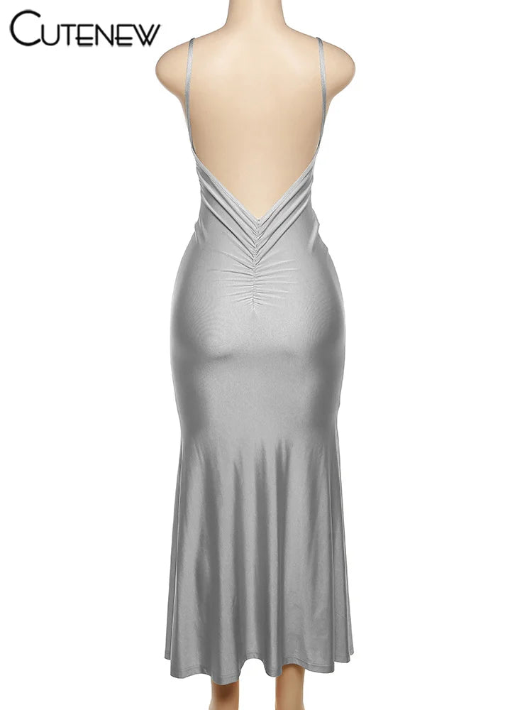 Nibber Red Shiny Spaghetti Strap Maxi Dress Women Solid Sexy Backless Ruched Cleavage Body-shaping Robe Lady Hipster Streetwear